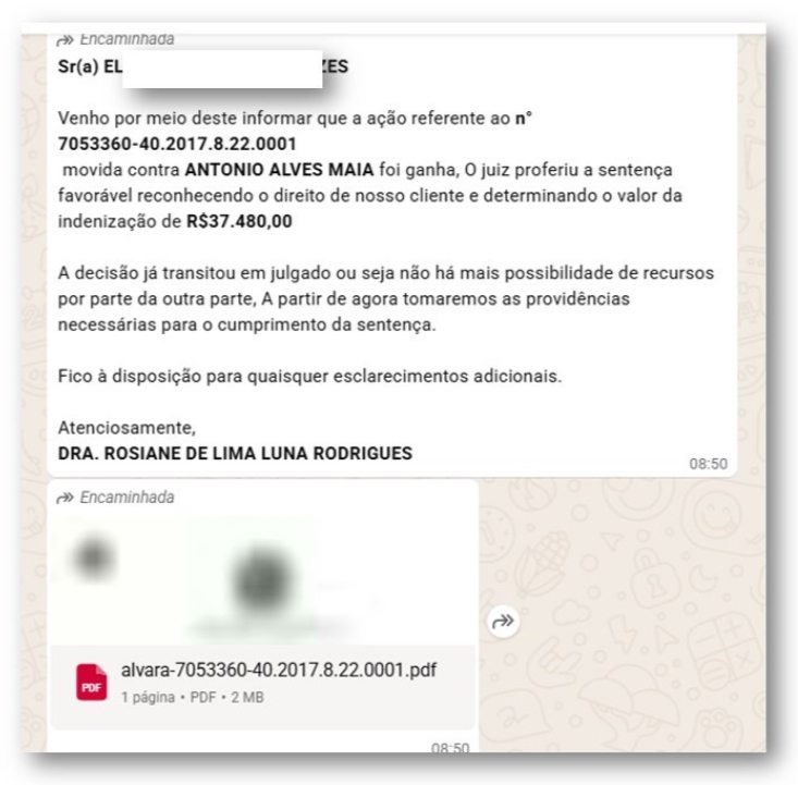 O comunicado fraudulento dizia que a ação movida contra “ANTONIO ALVES MAIA” teria sido julgada procedente, com sentença favorável e valor determinado de R$ 37.480,00, sem possibilidade de recurso. Em seguida, os criminosos solicitaram dados pessoais e bancários sob o argumento de “confirmar” o depósito.