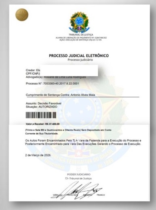Segundo relato da vítima, os golpistas afirmaram que ela teria direito a receber R$ 37.480,00 referentes a uma ação judicial supostamente já transitada em julgado. Para dar aparência de legalidade, enviaram um falso alvará judicial com o número do processo 7053360-40.2017.8.22.0001 e a informação de que a indenização seria depositada automaticamente na conta corrente.