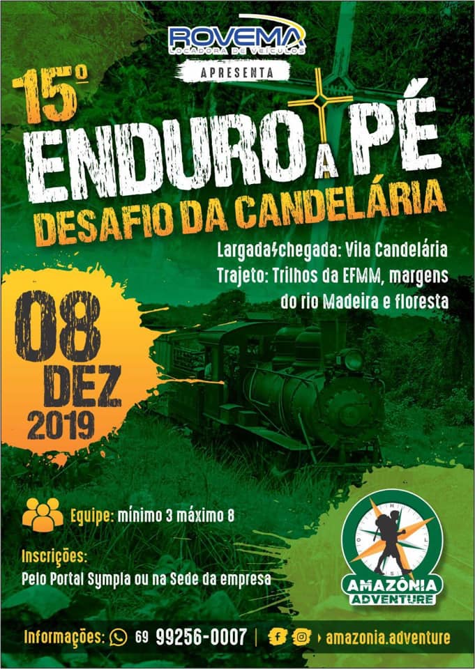 A Amazônia Adventure acaba de lançar a tradicional caminhada de aventura que todos os anos acontece em Porto Velho e movimenta centenas de participantes. Trata-se da 15ª edição do Enduro a Pé de Regularidade que este ano terá como tema "Desafio da Candelária" e acontecerá no dia 08 de dezembro durante toda a manhã sob os trilhos da Estrada de Ferro Madeira-Mamoré, passando por trilhas na mata e barrancos do rio Madeira.