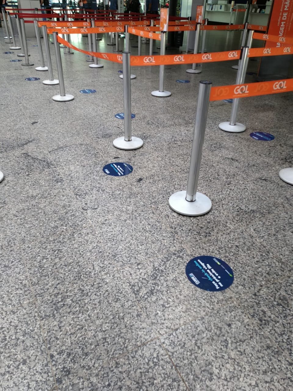 - Distanciamento de pelo menos dois metros entre pessoas no aeroporto – com sinalização por meio de adesivos de mesa, piso e assentos, especialmente em locais como check-in, canais de inspeção, portões e pontes de embarque, esteiras de bagagem, áreas de alimentação, entre outros locais com fluxo de passageiros.