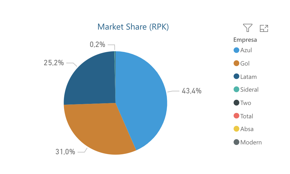 A escalada da Azul iniciou em abril, quando a companhia alcançou o segundo lugar em market share doméstico, atrás da Gol e ultrapassado a Latam. A queda da Latam é ainda mais representativa pelo fato de a companhia ter contato com a maior oferta entre as três para o mês.