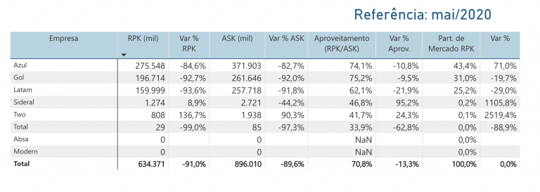 A Latam reduziu sua demanda em 91% e viu a oferta cair quase 95%, o que resultou em um aproveitamento (relação entre demanda e oferta) abaixo de 50% (48,8%). A Azul por sua vez reduziu a oferta em 87% e a demanda caiu 89%, resultando em um aproveitamento de quase 70%. A Gol teve o melhor aproveitamento (79,7%), com reduções semelhantes em demanda e oferta (92,7% e 92,6%, respectivamente).