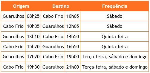 A Gol, em parceria com a Voepass, passa a operar em três cidades com voos partindo de Guarulhos: Cabo Frio (RJ), São José do Rio Preto (SP) e Ribeirão Preto (SP). As vendas de passagens para os três destinos começam nesta quarta-feira (13) para voos a serem realizados a partir de25 dezembro para Cabo Frio, e a partir de 7 março de 2022 no caso das cidades paulistas.