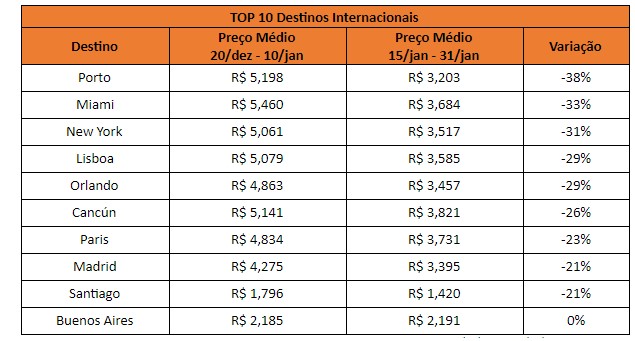 O metabuscador de viagens Kayak apontou que tanto destinos nacionais quanto internacionais mostram queda no preço médio das passagens aéreas se compradas para a segunda quinzena de janeiro, em comparação com viagens programadas entre 20 de dezembro e 10 de janeiro, período de festas. A diferença pode chegar a 38% no preço médio de passagens aéreas.