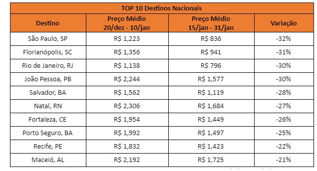 Quanto aos destinos nacionais, São Paulo é o que tem a maior redução do preço médio, com 32% de variação se a viagem for na segunda quinzena de janeiro, ao invés do fim de dezembro e começo de janeiro. No ranking, que inclui sete cidades do Nordeste, também tiveram diminuição Florianópolis (-31%); Rio de Janeiro (-30%); João Pessoa (-30%); Salvador (-28%); Natal (-27%); Fortaleza (-26%); Porto Seguro (-25%); Recife (-22%) e Maceió (-21%).