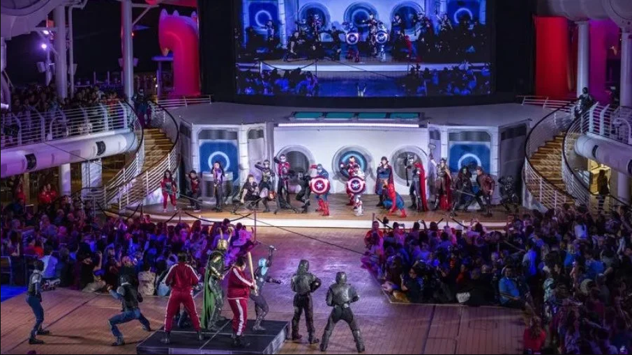 Show no deque de um dos navios da Disney com personagens da Marvel