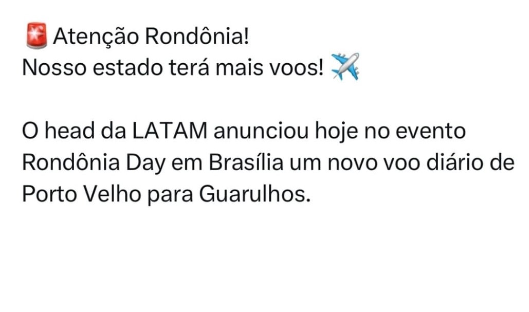 Durante um evento em Brasília (DF) no dia 26 de março, chamado de Rondônia Day, um deputado federal anunciou com pompa que Rondônia terá mais um voo diário entre Porto Velho e Guarulhos que será operado pela Latam. Será suficiente para atender a demanda e os preços serão reduzidos? A conferir a “novidade”.
