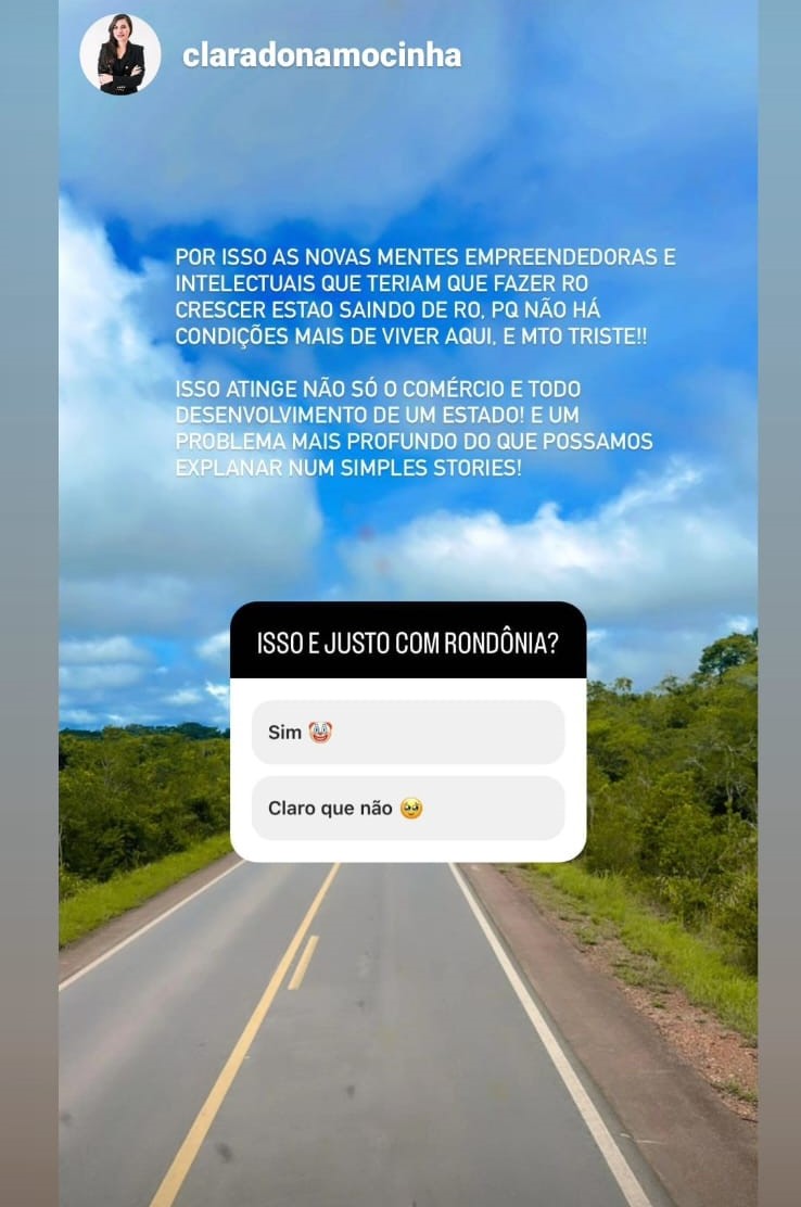 Mas para isso, tem que ir para um dos estados vizinhos: Acre ou Mato Grosso. É o caso da empresária Ana Clara, proprietária de loja no shopping de Porto Velho, que publicou stories no Instagram.