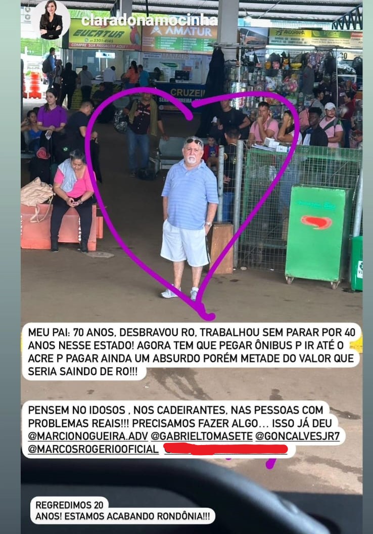 “Meu pai: 70 anos, desbravou RO. Trabalhou sem parar por 40 anos nesse estado. Agora tem que pegar ônibus para ir até o Acre para pagar ainda um absurdo, porém metade do valor que seria saindo de RO! Pensem nos idosos, nos cadeirantes, nas pessoas com problemas reais! Precisamos fazer algo! Regredimos 20 anos! Estamos acabando Rondônia!!!”.