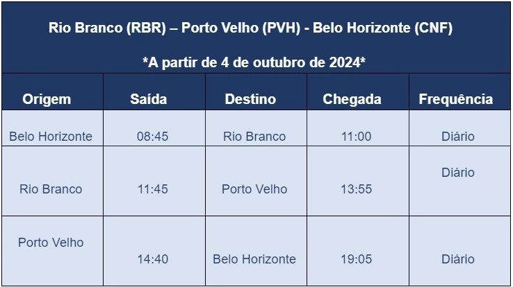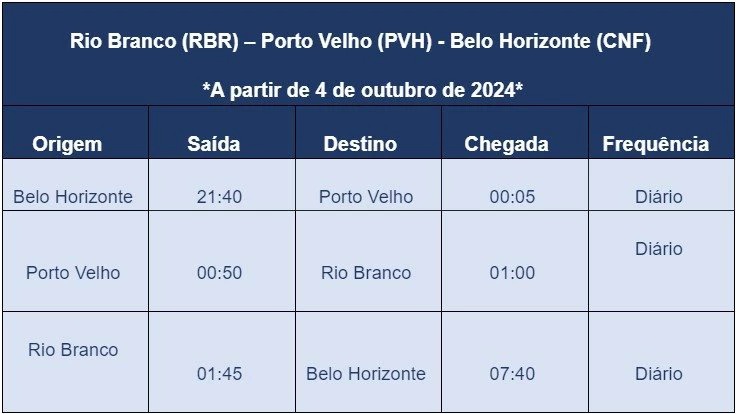 Tabela com saídas de Belo Horizonte para Porto Velho, e depois, Rio Branco, e de lá, para Belo Horizonte (MG) - Foto: Reprodução de tela