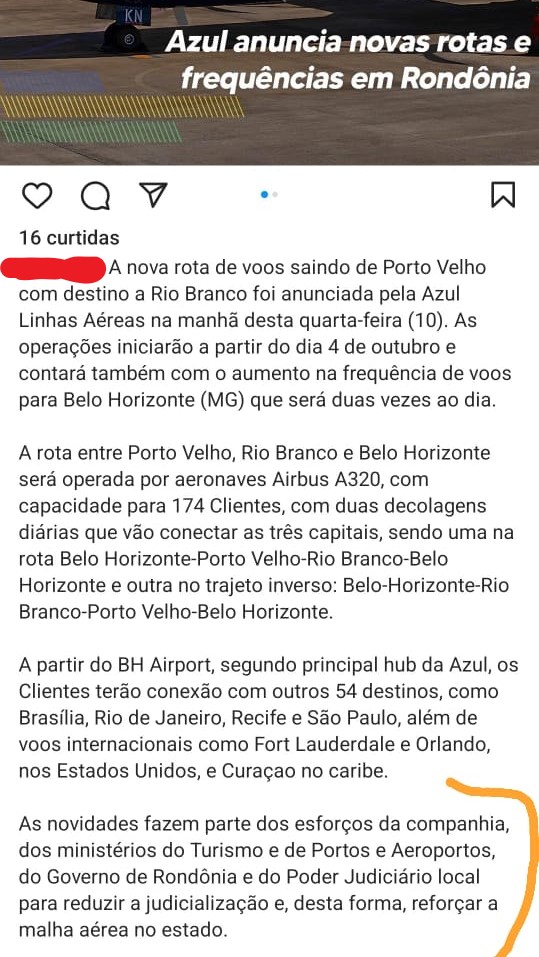Recentemente, a Azul Linhas Aéreas, ao anunciar novos voos entre Rio Branco e Porto Velho comemorou que “as novidades fazem parte dos esforços da companhia [...] e do Poder Judiciário local para reduzir a judicialização e, desta forma, reforçar a malha aérea no estado”, conforme trecho de comunicado enviado para a imprensa rondoniense e acreana”, (conforme reprodução de tela nesta reportagem).