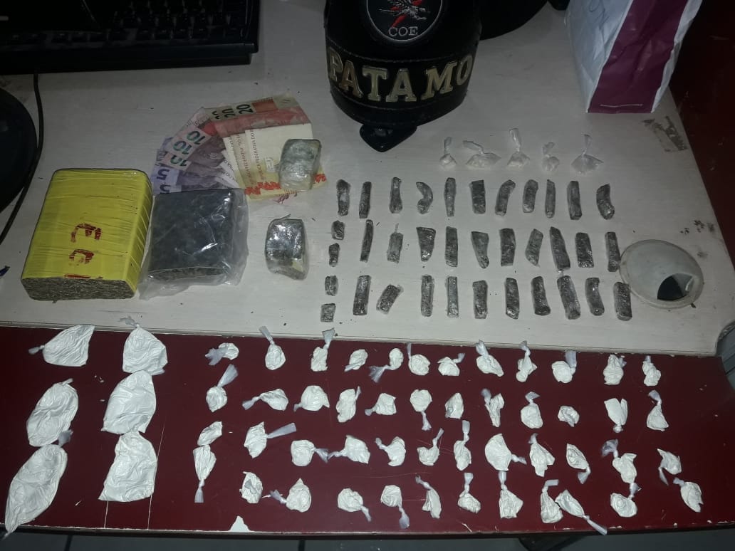 Em uma bolsa infantil com a mulher foram encontradas 21 porções de cocaína e dentro da casa mais 70 porções, além de quase R$ 200,00 em espécie