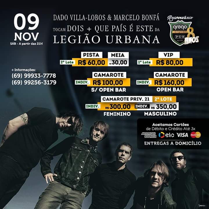Dia 09 de novembro vai ser comemorado o 8° aniversário do Grego Original e os 30 anos de lançamento dos discos DOIS + QUE PAÍS É ESTE, trazendo os melhores sucessos da banda 'Legião Urbana'.