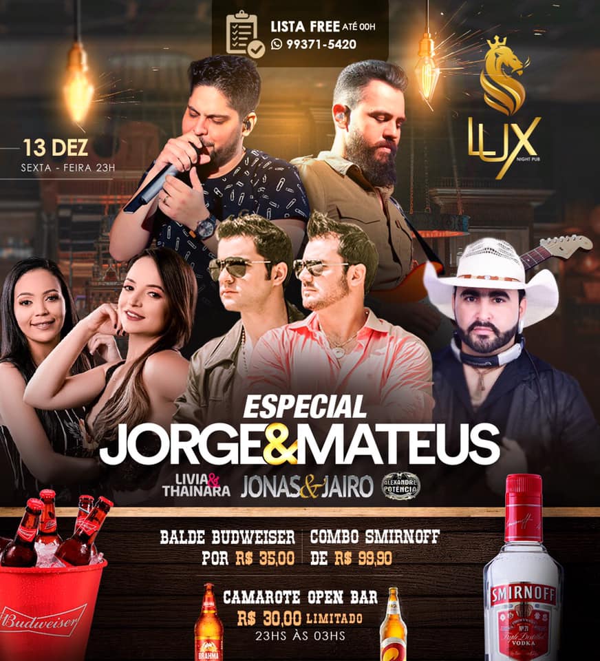 Vocês Pediram e a LUX NIGHT PUB vai fazer novamente, chame a galera para curtir uma sexta animada e descontraída! Trazendo uma das atrações da noite, que é Jonas & Jairo cantando os maiores sucessos da dupla Jorge & Mateus referência do Sertanejo Universitário e muito mais.